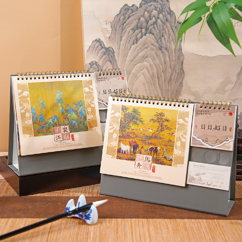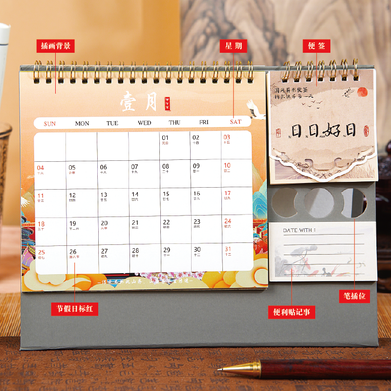 得将 2026年新款中式国风插画台历简约大气日历同色底座送礼桌面摆件支持学校企业定制logo