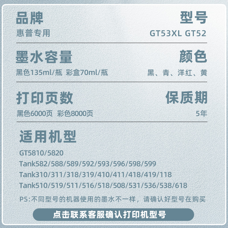惠普打印机墨水墨仓式连供专用墨水黑色GT53XL彩色gt52tank519511 510 518 411 410 599 672 592打印机非原装