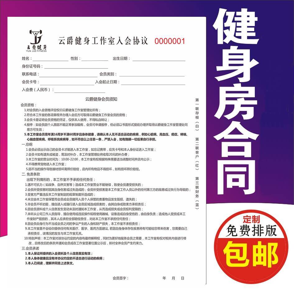 定制幼儿游泳培训私教入会协议合同水育情况记录单二联游泳馆单据