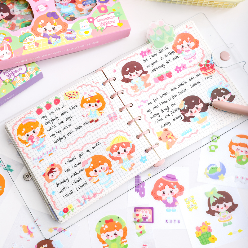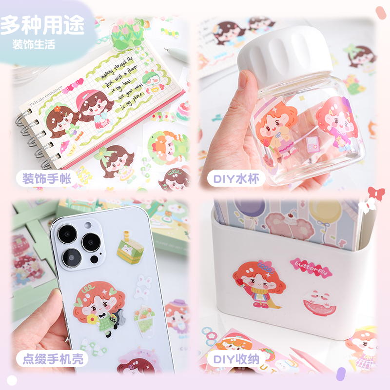 手帐贴纸礼盒贴画100张不重复咕卡装饰PET防水小图案女孩儿童手账工具可爱卡通透明素材贴奖励高颜值手杖水杯
