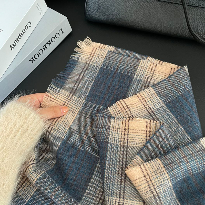 韩国文艺日系小格子简约短须蓝色围巾手工编织保暖围脖女冬季披肩