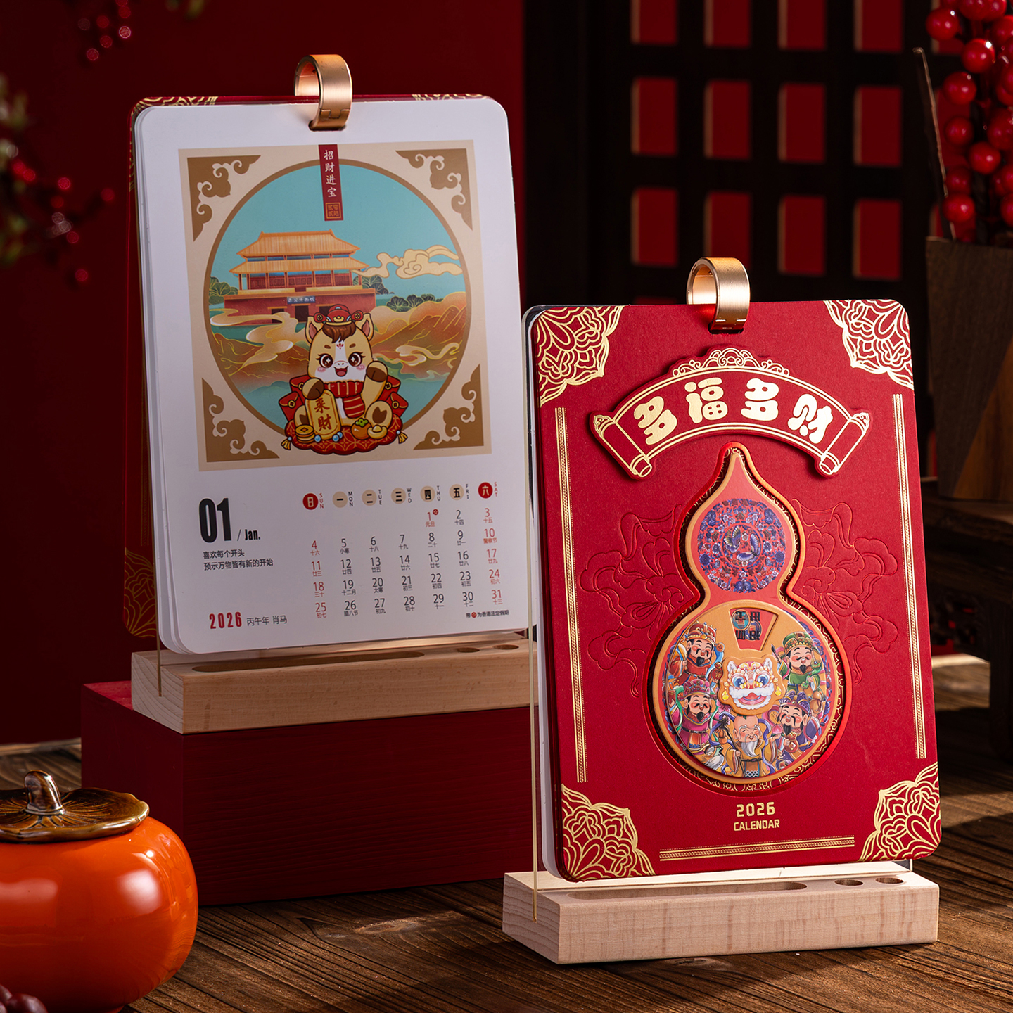 马上暴富2026年木质台历定制中国风马年竖款日历本高档榉木红色喜庆创意办公桌面摆件记事本企业LOGO来图定做