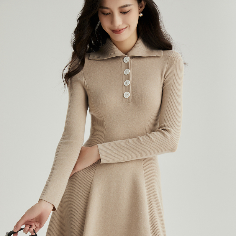 OBEG欧碧倩秋冬气质温柔翻领羊毛针织修身连衣裙50464521