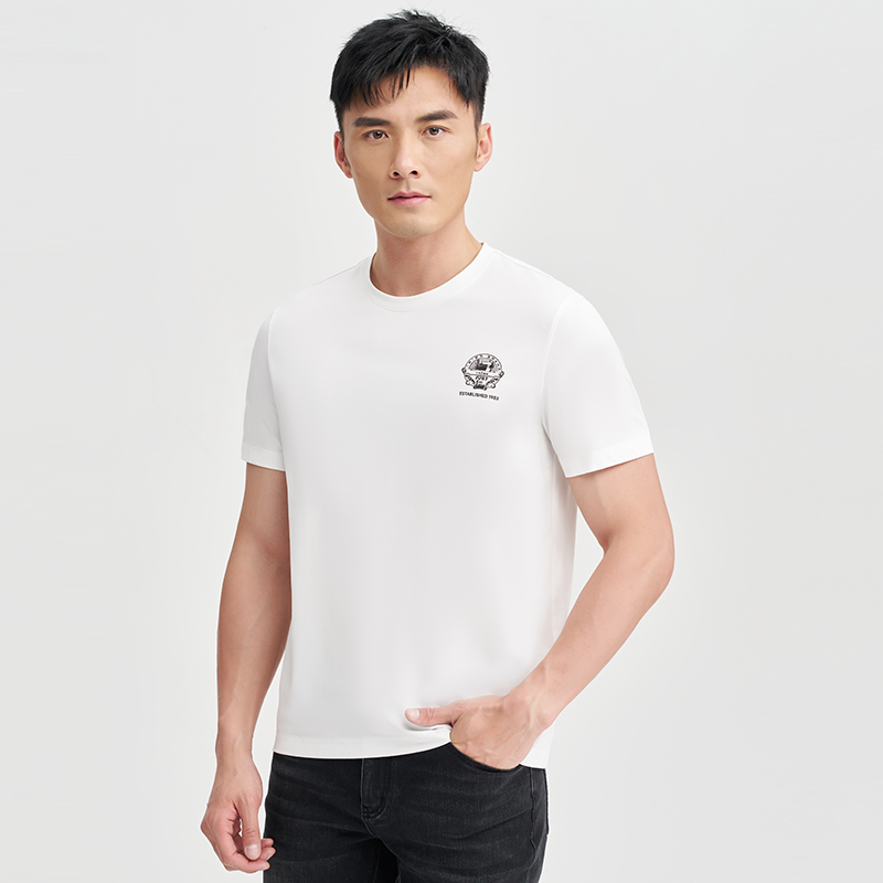 才子男装白色圆领短袖T恤男2025夏季新款透气后背印花休闲上衣潮
