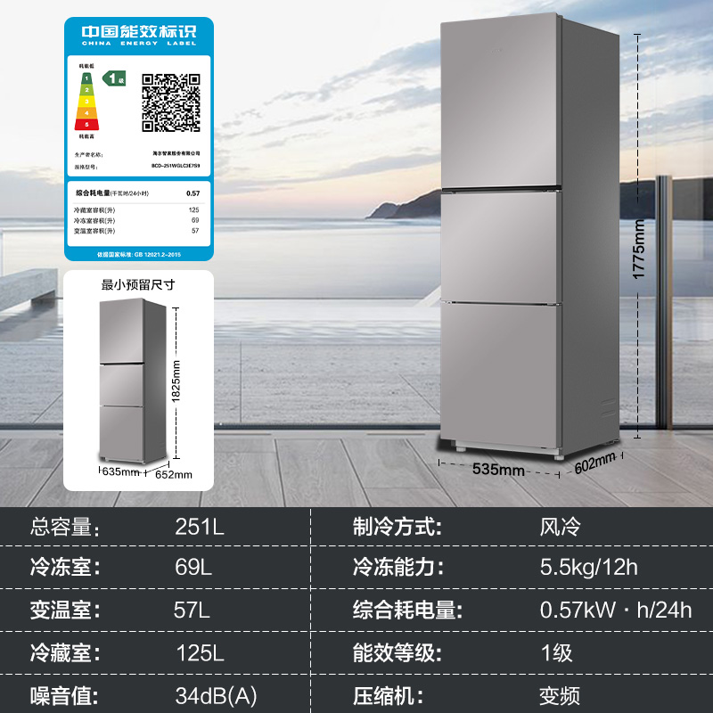 政府换新补贴海尔统帅三开门251L一级风冷无霜租房小型家用电冰箱