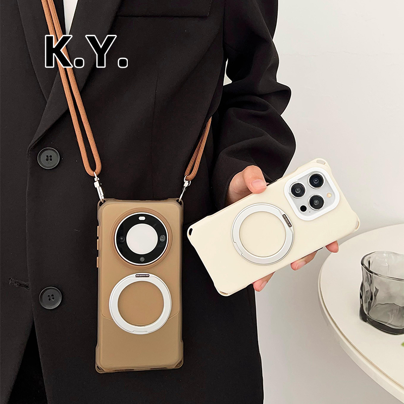 高级感360°旋转磁吸支点壳适用苹果16PROMAX华为mate70PRO纯色VIVOX200小米14挂绳斜挎手机壳四角开孔防摔
