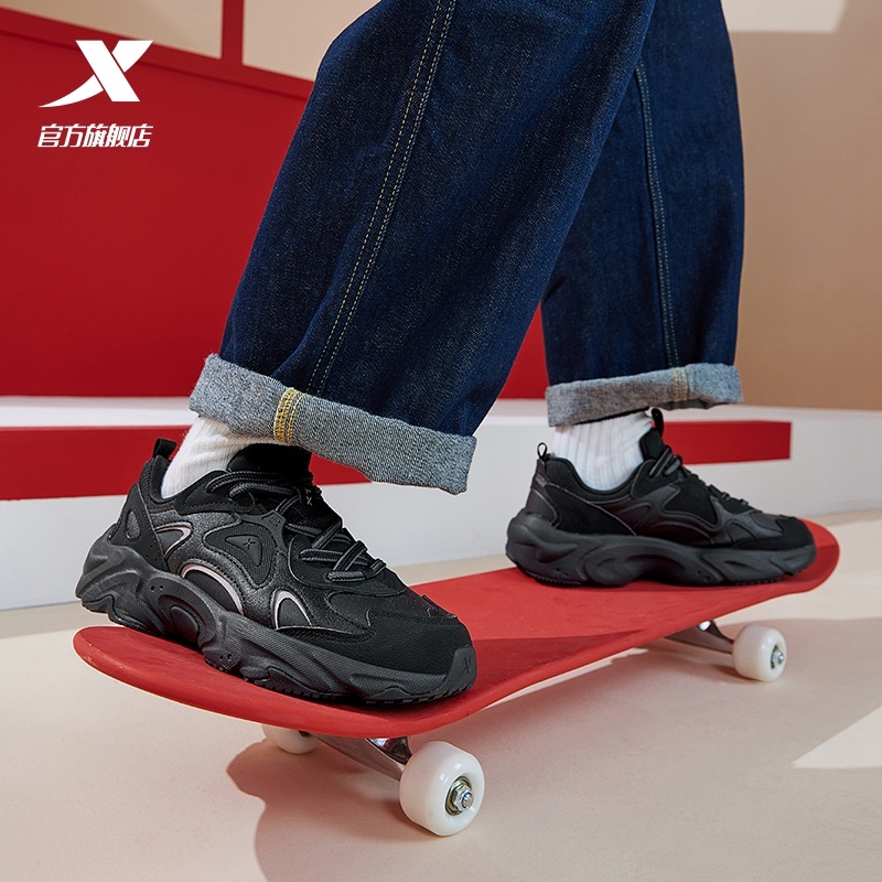 特步星火休闲鞋男鞋秋季革面轻便百搭厚底增高女鞋网面透气运动鞋