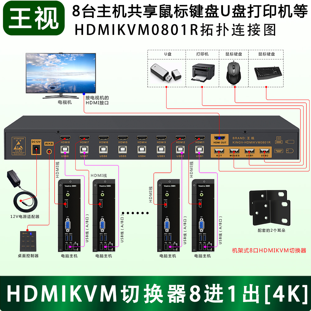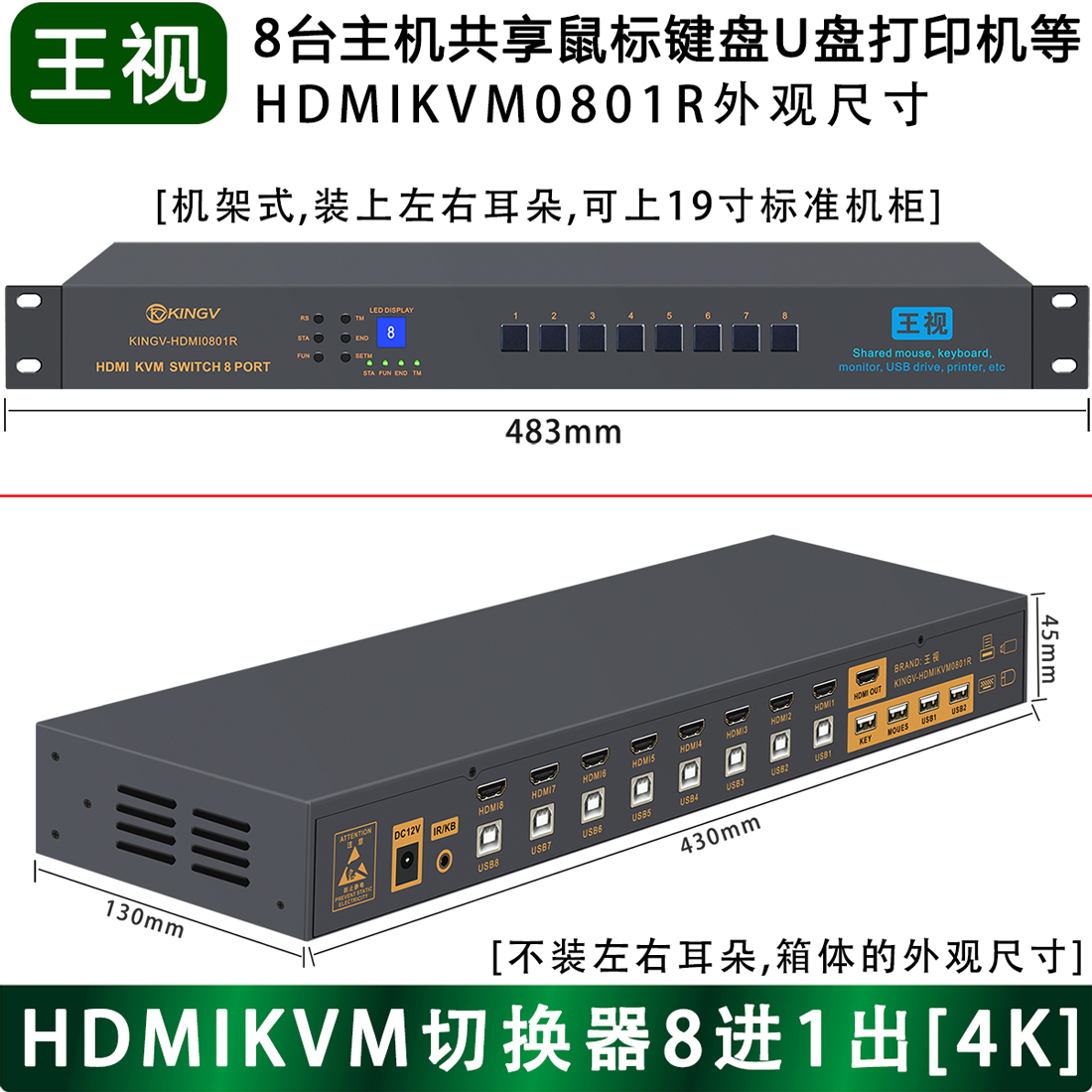 王视 kvm切换器hdmi八进九进四进一出监控录像机切换器16口9口8口4口共享1套键鼠u盘打印机usb设备4k机架式
