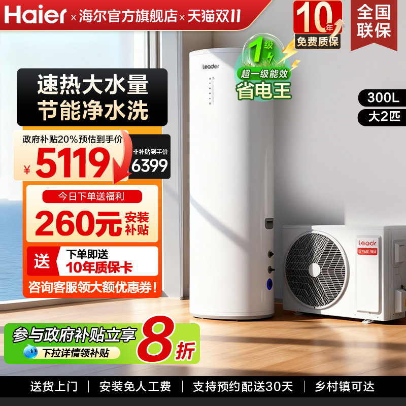 国补海尔空气能热水器家用300升200L商用500大容量一级能效变频款