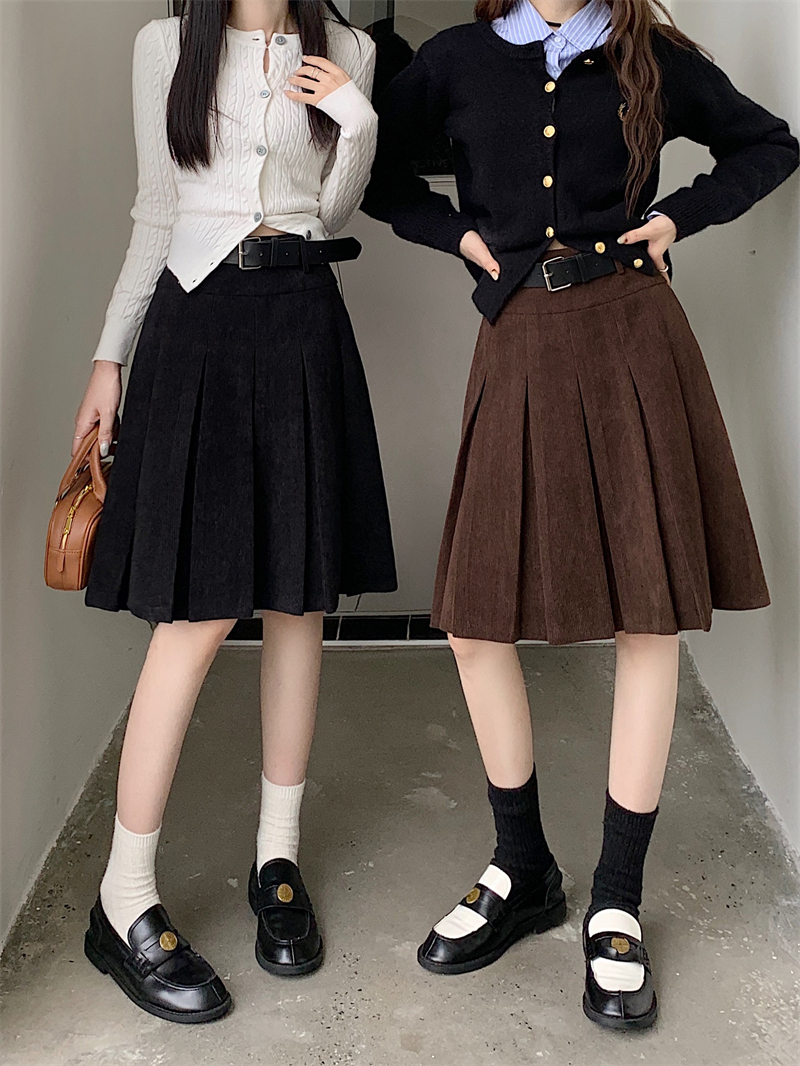 大码复古灯芯绒百褶裙女中长款秋冬遮胯a字裙设计感条绒裙半身裙