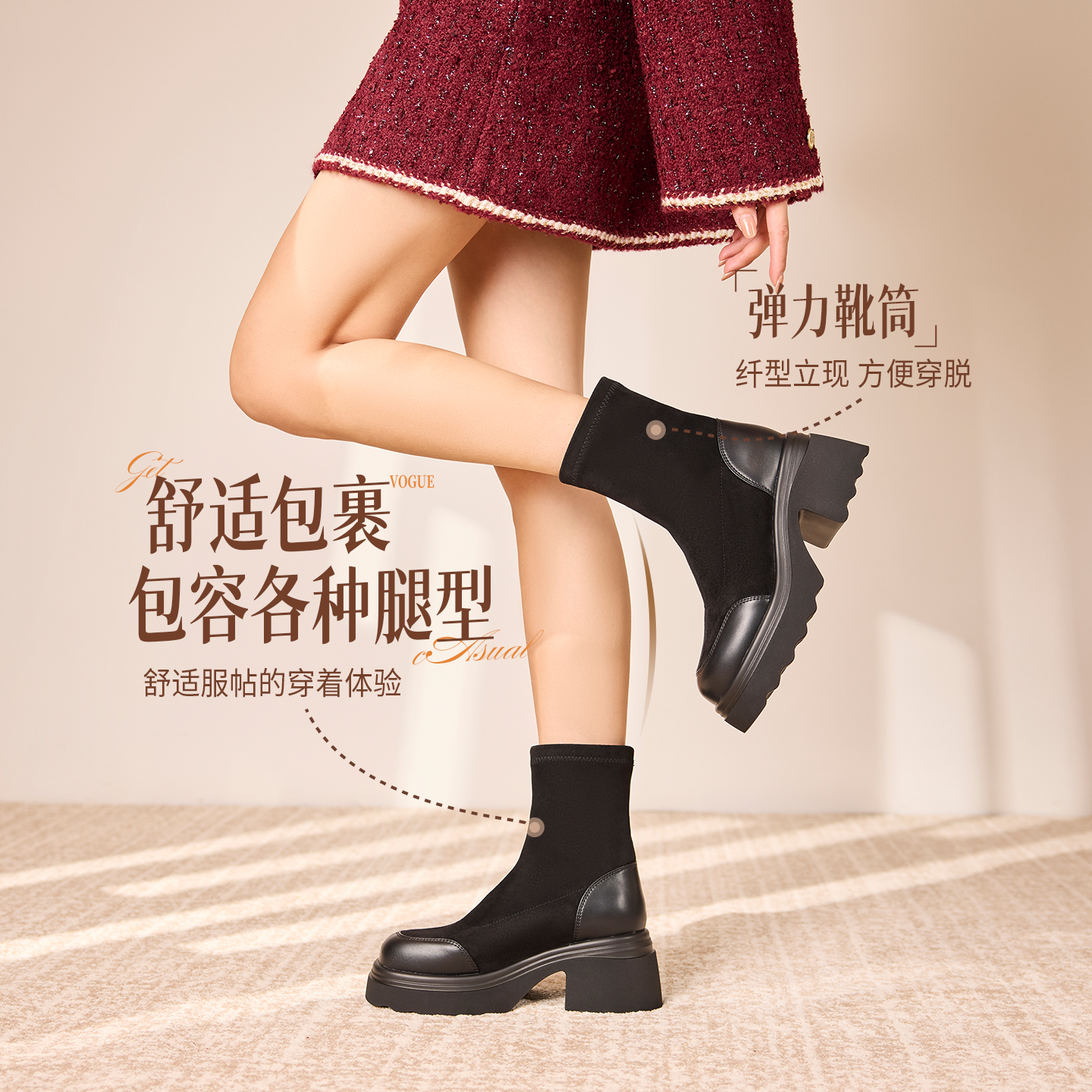 千百度冬季弹力靴细高跟袜靴新款拼接时装靴洋气小短靴女鞋通勤