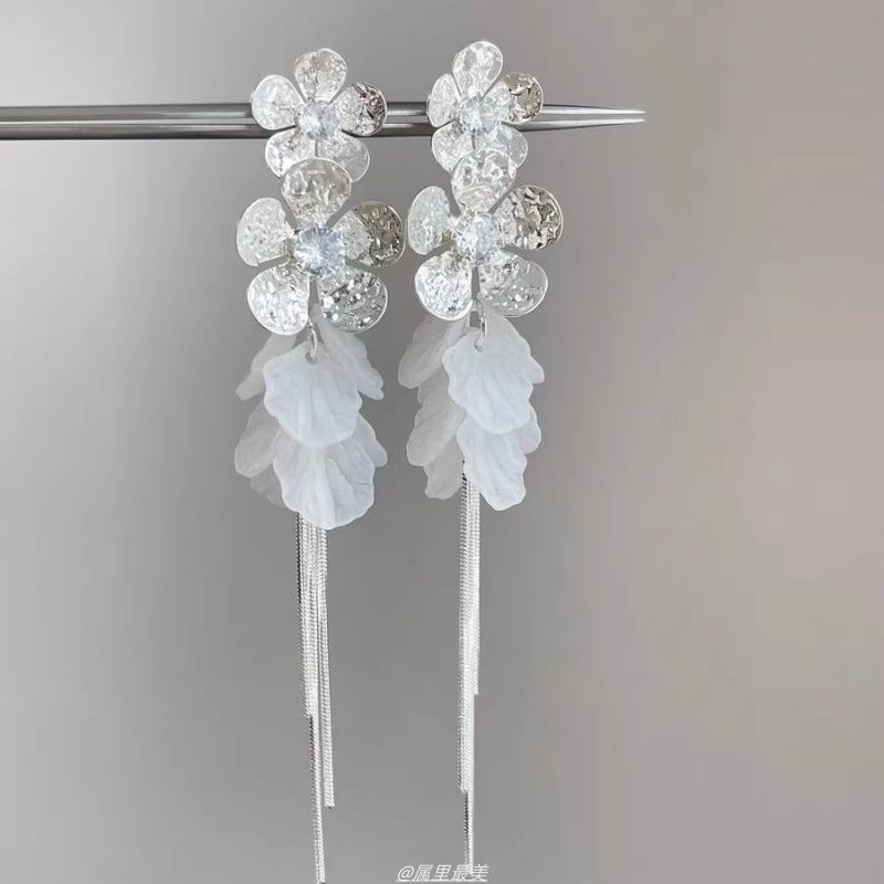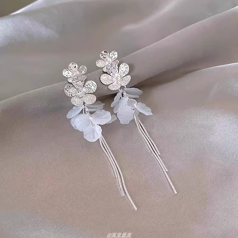 玫瑰冰茶~蓝色流苏花朵耳钉女高级感度假风小众耳环绝美耳饰耳夹