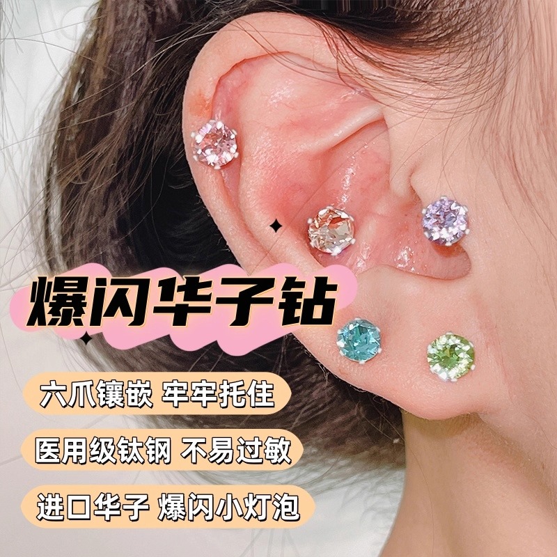 施家华子6mm~彩钻耳蜗耳骨耳钉超闪百搭女医用级钛钢防过敏防红肿