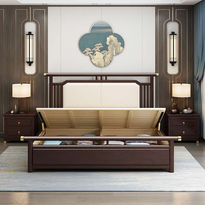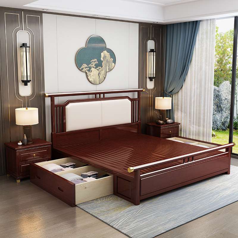 新中式实木床1.8米双人床现代轻奢卧室软靠床1.5米气压抽屉高箱床