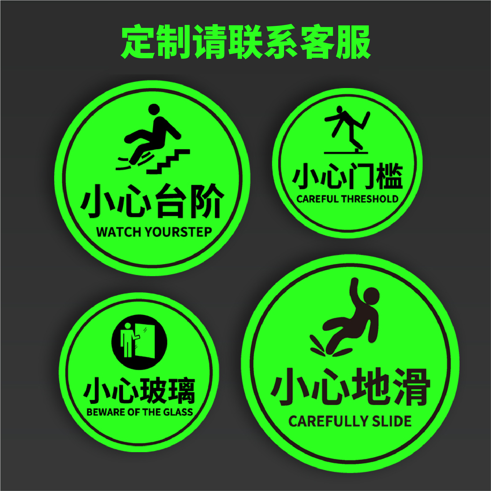 定制创意小心台阶地滑玻璃碰头斜坡门槛楼梯地贴夜光发光安全标识温馨提示牌安全出口警示贴防控疏散荧光地贴