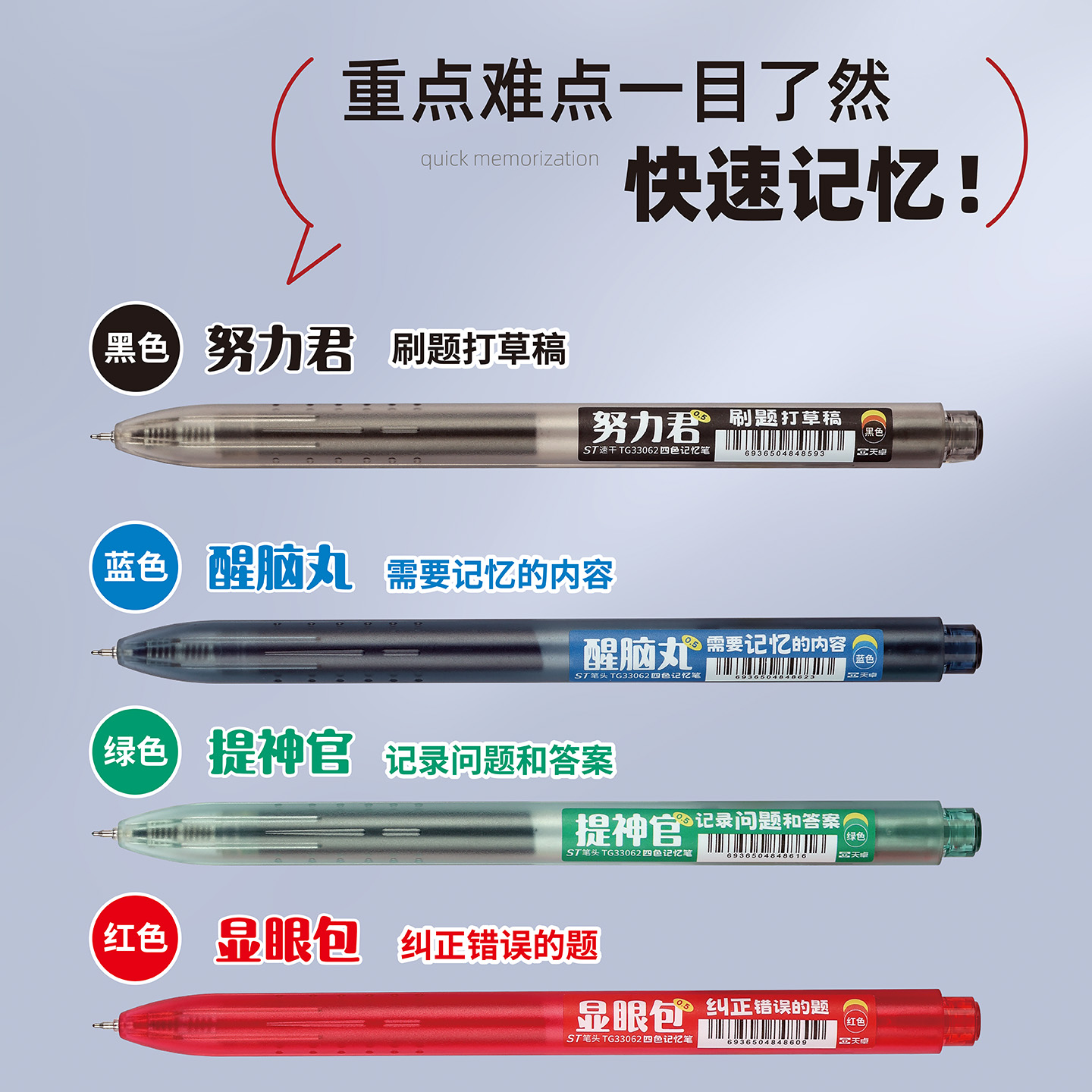 按动四色记忆笔刷题笔彩色中性笔学生做笔记划重点专用大容量高颜值黑色红色水笔4色笔书写顺滑蓝色圆珠笔0.5