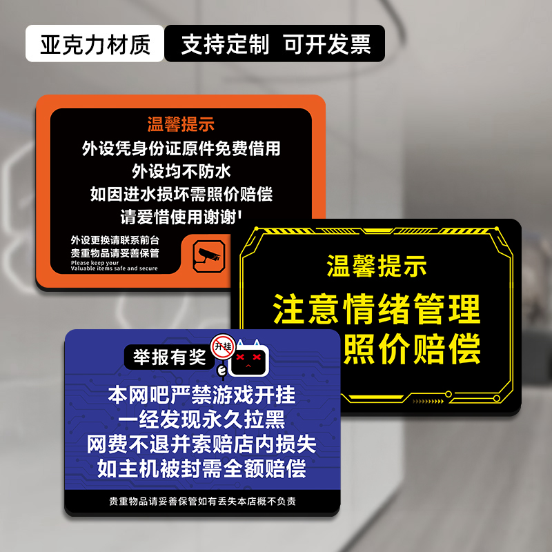 亚克力网吧禁止开挂警示牌禁止未成年人入内标识牌定制电竞酒店网咖外设主机损坏照价赔偿提示牌内容标牌墙贴