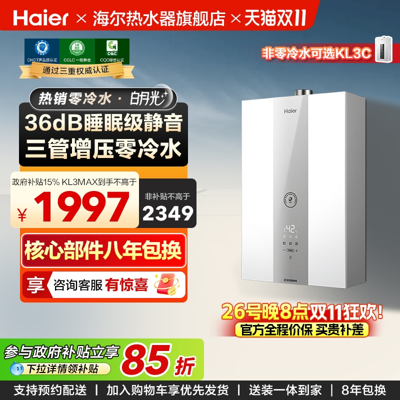 海尔官方静音燃气款热水器水伺服零冷水增压家用恒温白月光KL3MAX