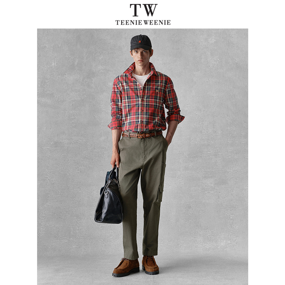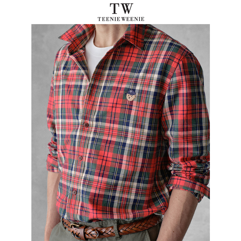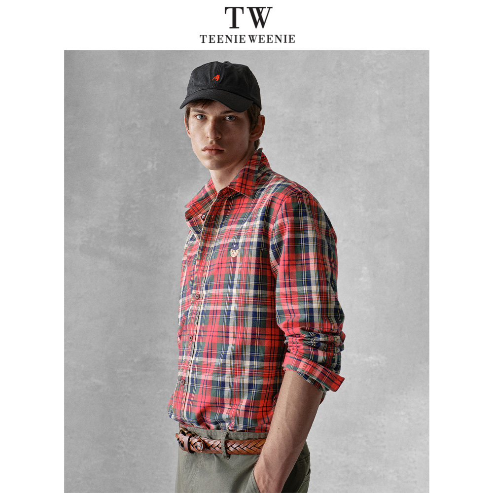 Teenie Weenie小熊男装简约长袖休闲宽松刺绣格纹翻领衬衫上衣