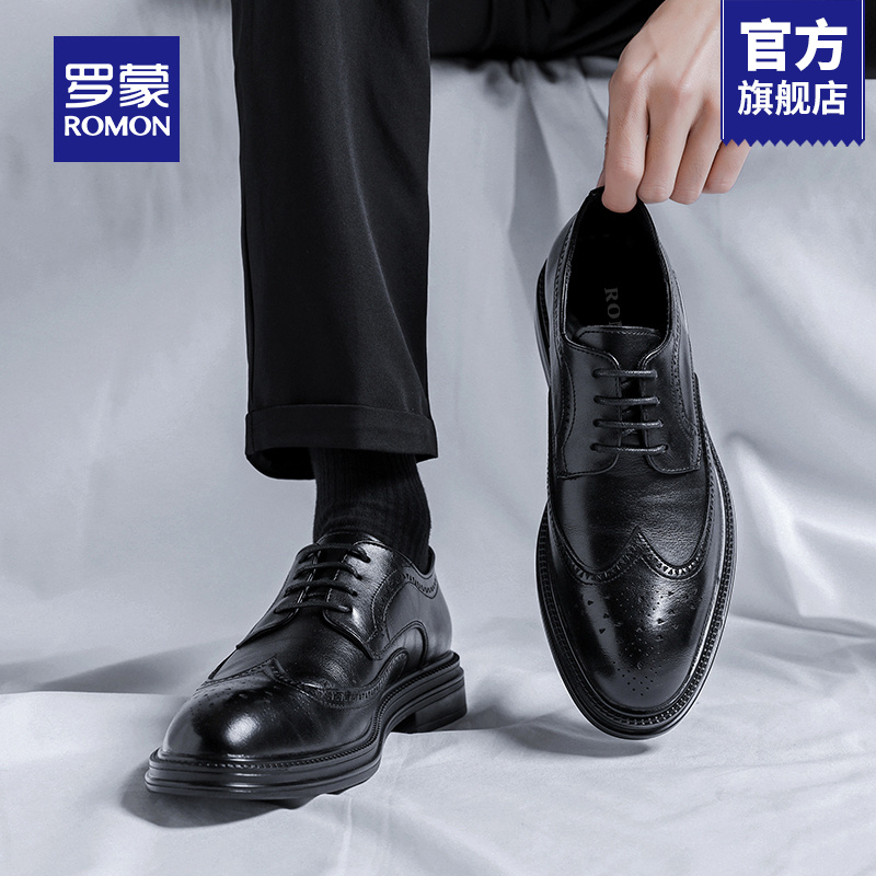 罗蒙布洛克皮鞋男年轻商务正装软底通勤雕花男鞋冬季尖头德比鞋RM