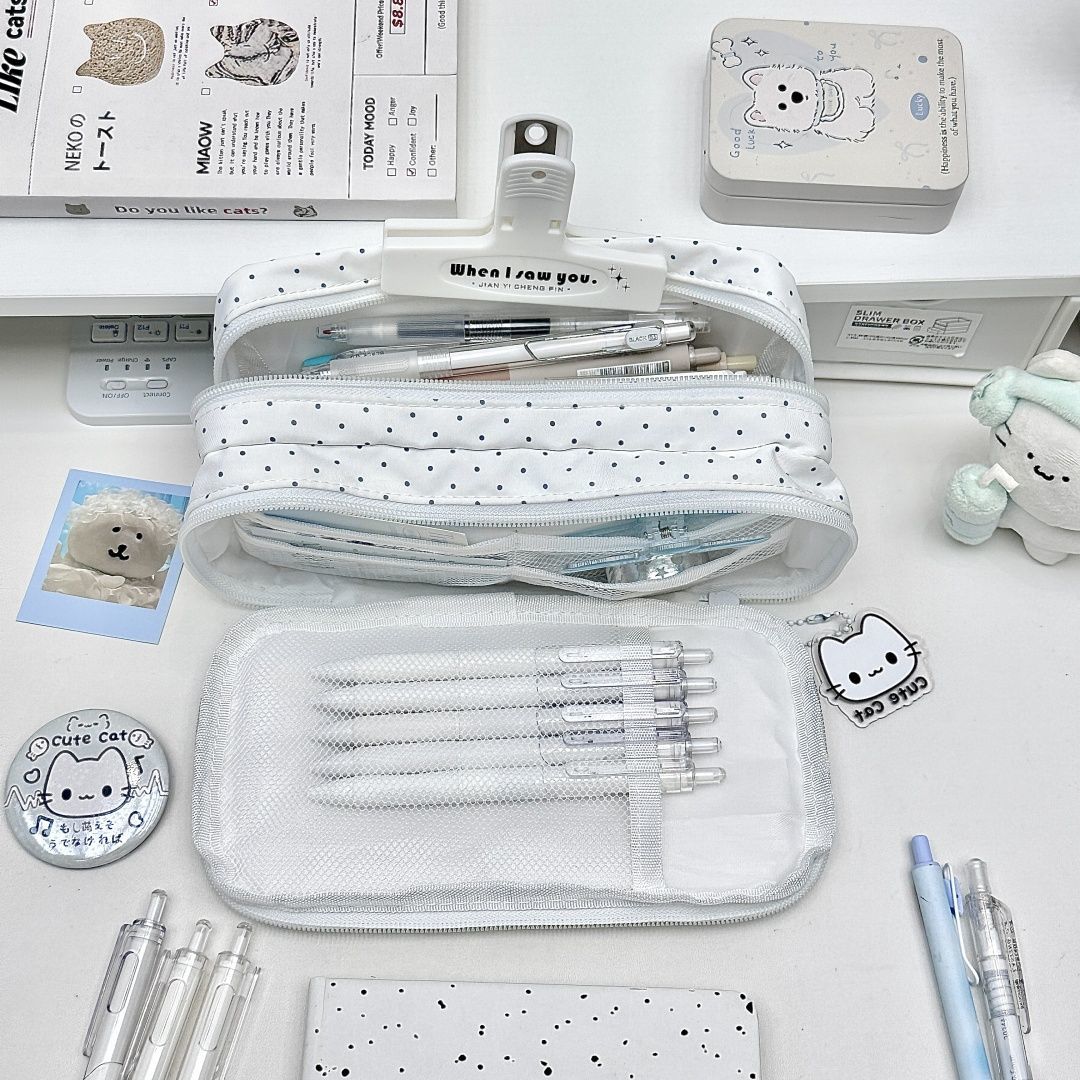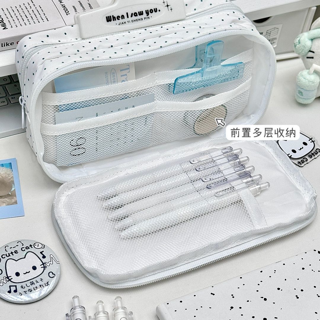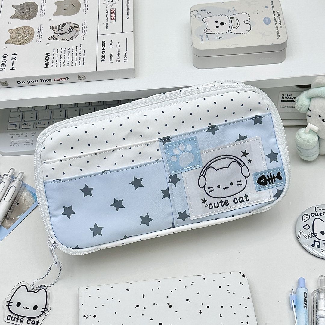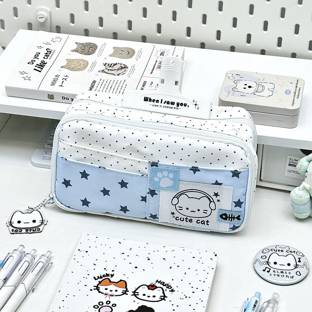 ins高颜值蓝色音乐波点小猫多层痛包笔袋大容量铅笔文具袋收纳袋