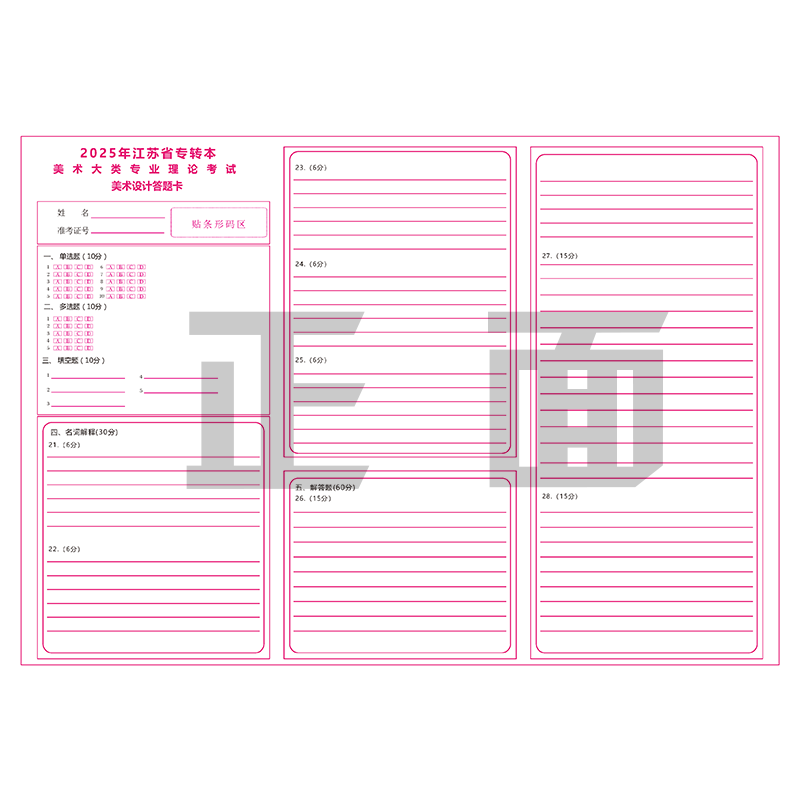 2025年江苏省专转本美术大类专业理论考试美术设计答题卡模拟考试专用A3双面媲美考试纸张支持定制