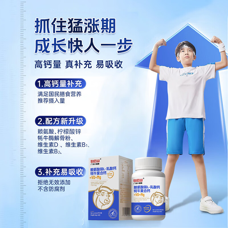 白云山赖氨酸乳酸钙片生长素青少年学生儿童成长长高健康补钙咀嚼