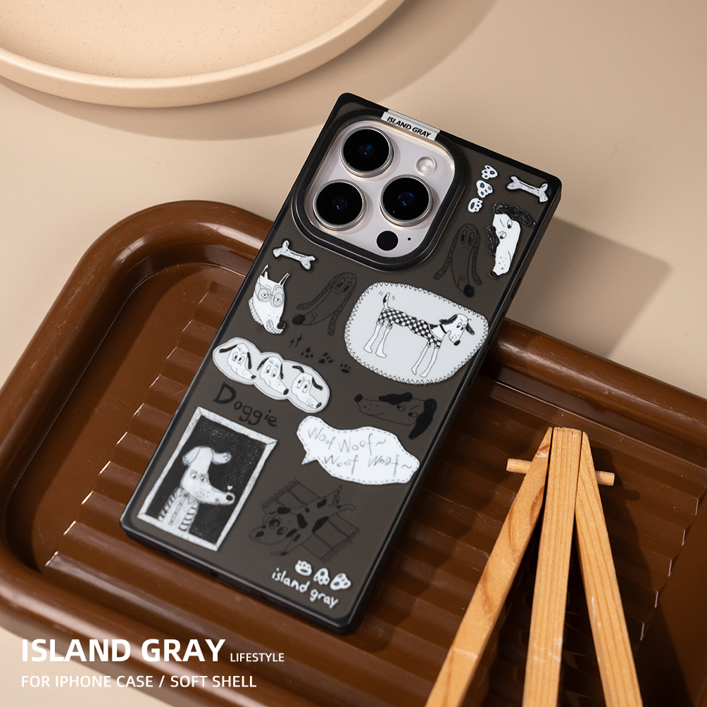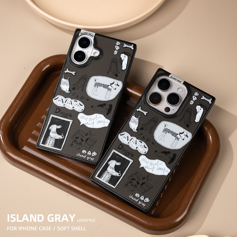 灰岛 黑白手绘小狗透黑方形手机壳 双层印花 适用于苹果iPhone17 16 15 14 Pro Max 原创设计 可爱少女