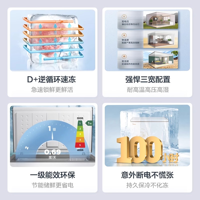 美的301L大容量冰柜家用商用两用冷柜卧式全冷冻冷藏减霜大型冰箱