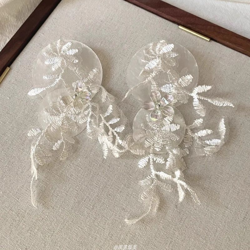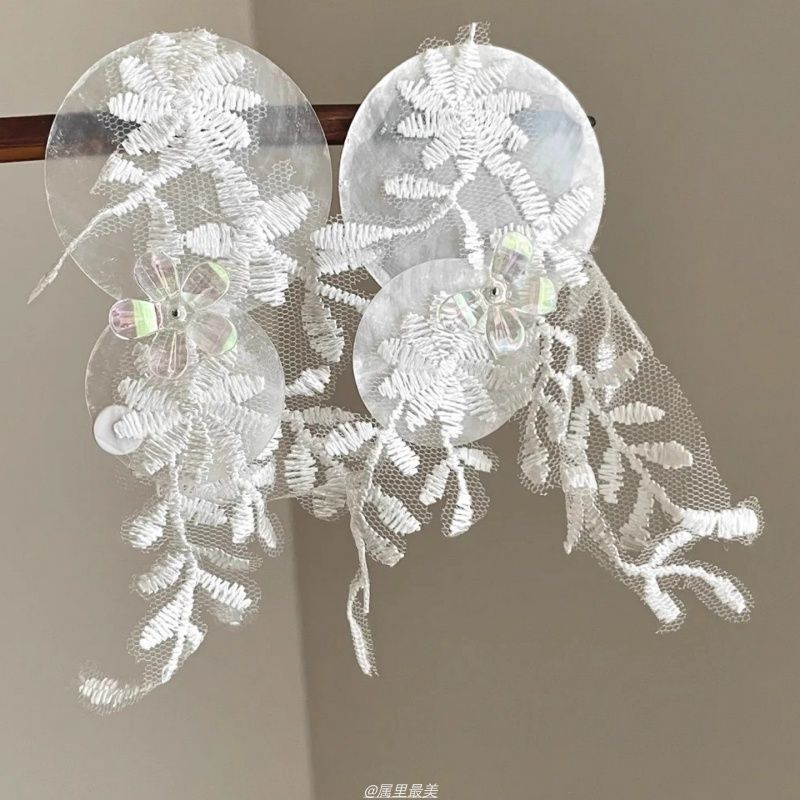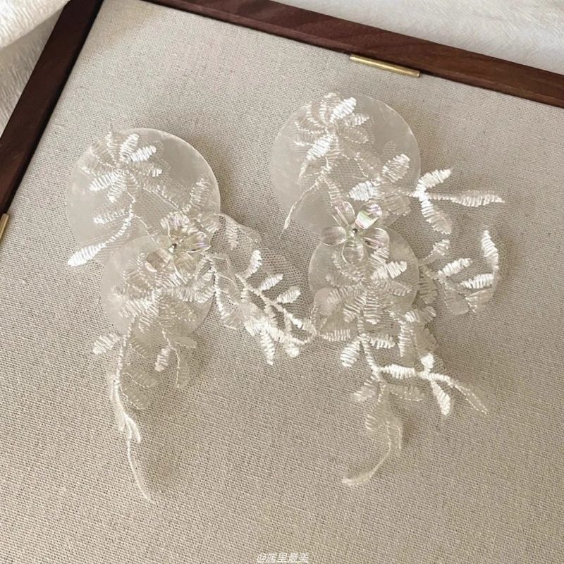 【贝浪白纱】天然贝壳圆片网纱刺绣花朵耳环女度假风耳钉新娘耳饰