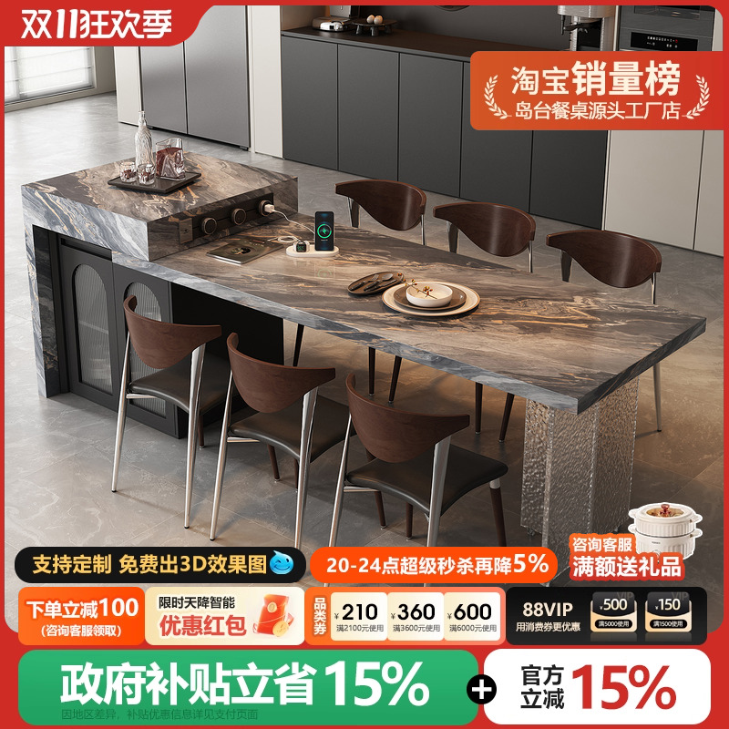可定制意式轻奢岛台餐桌一体家用可伸缩岩板开放式厨房高级感导台