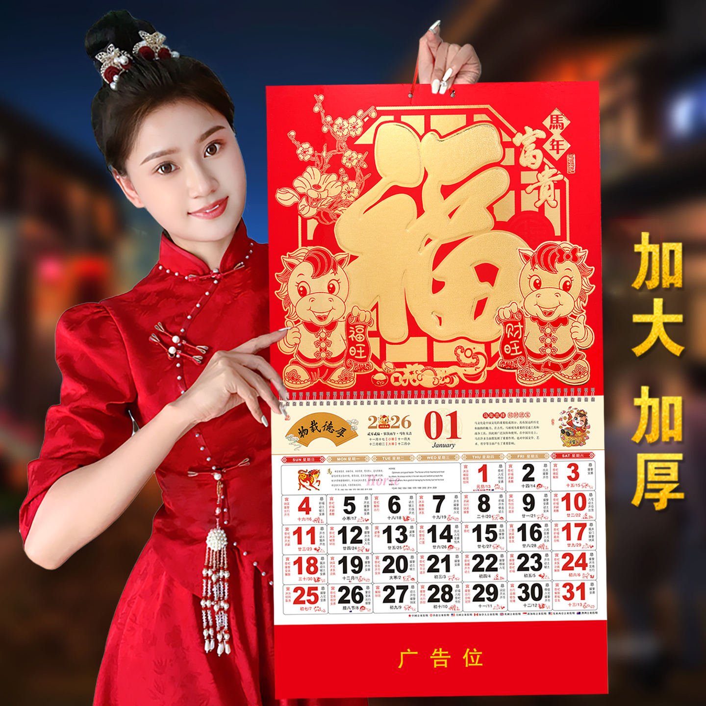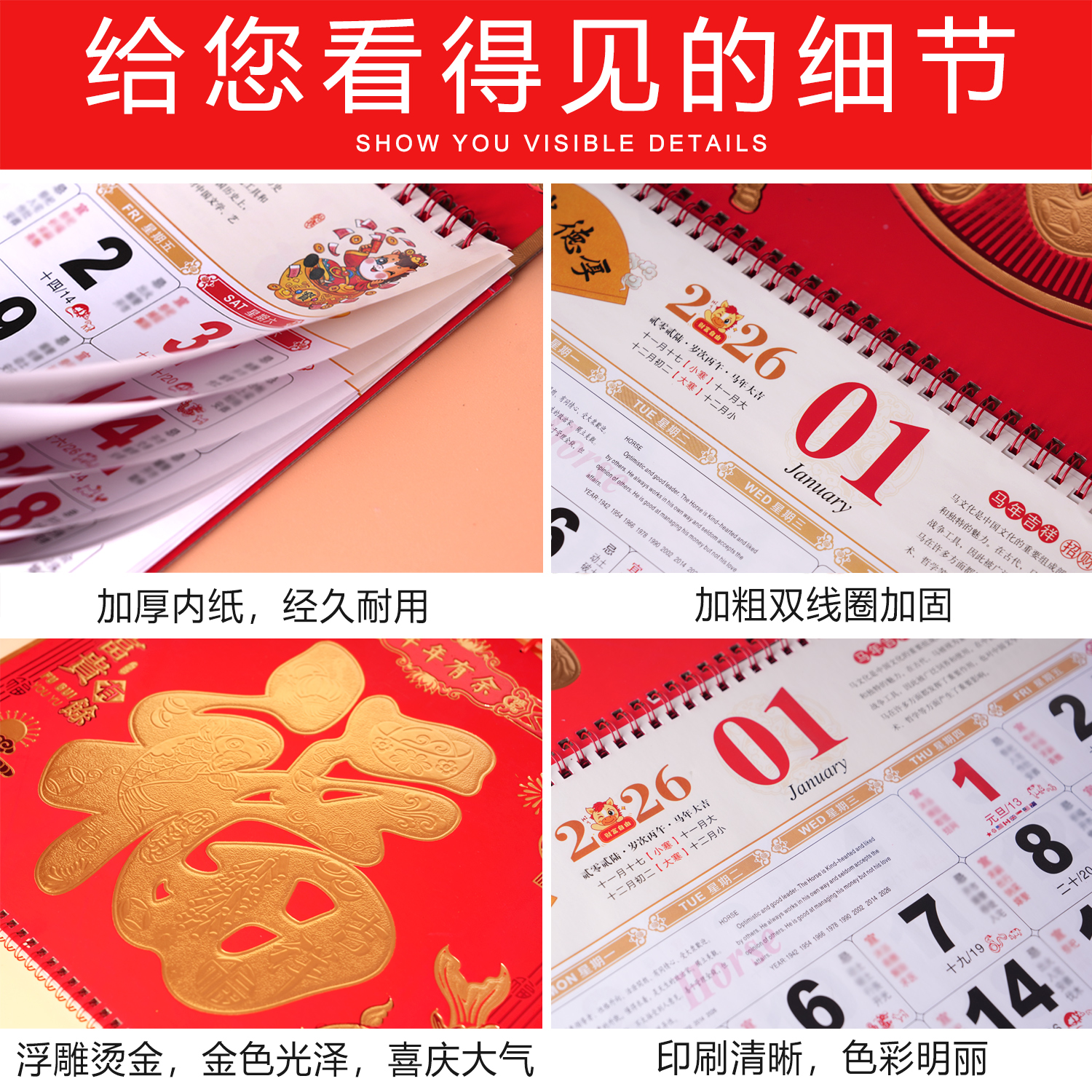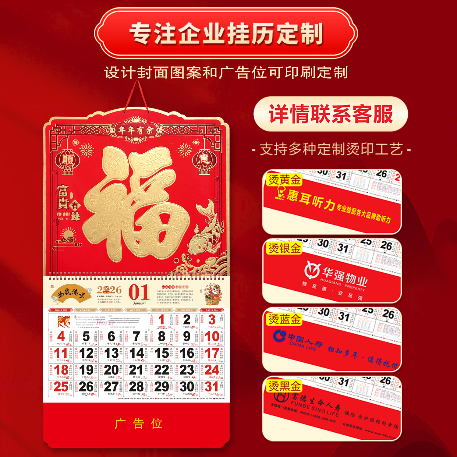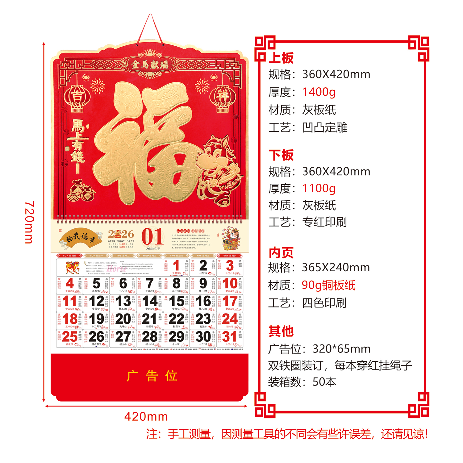 2026年福字吊牌挂历马年鸿运春到福到金福吊牌加厚立体浮雕福字挂历月历高端家用月份牌广告定制烫金