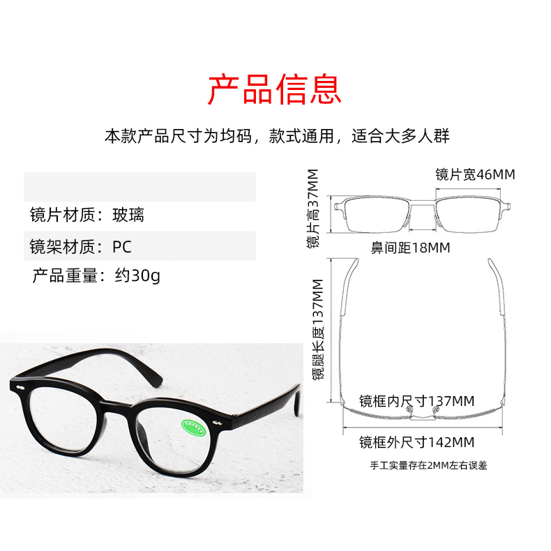 老花镜高清镜片防过敏男女同款眼镜老人玻璃舒适水晶100度镜框