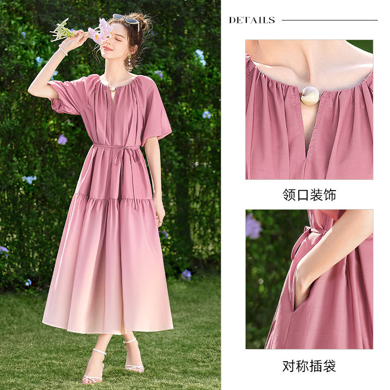 她池渐变色连衣裙2025夏装新款女装时尚优雅法式泡泡袖收腰中长裙