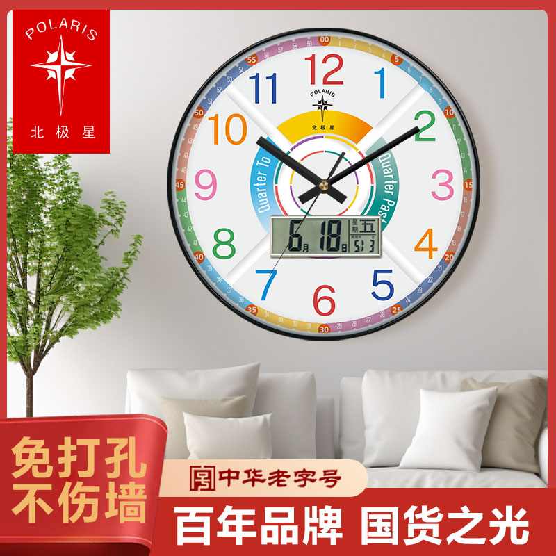 北极星早教学习挂钟家用卧室自动对时电波钟背景墙学生钟表万年历
