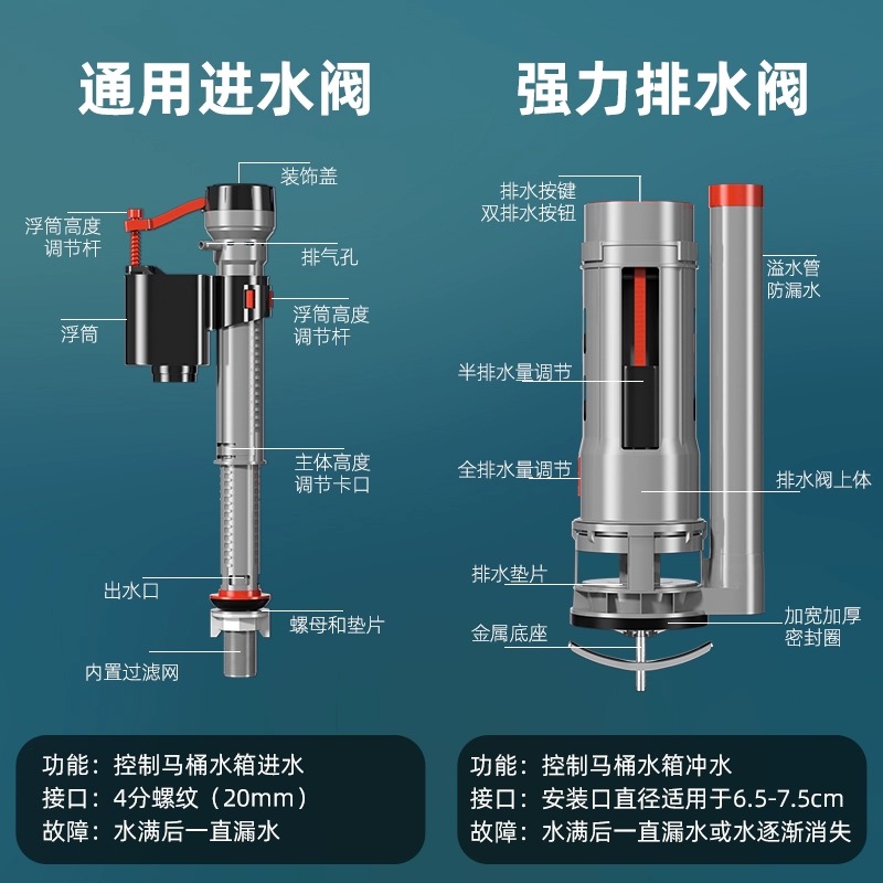 通用马桶水箱配件进水阀排水阀老式抽水冲水大全按钮浮球上水静音