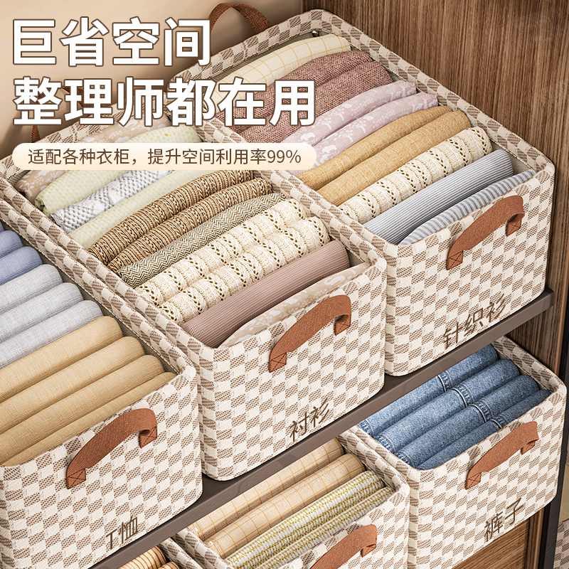 棉麻衣服收纳箱家用叠加衣柜放衣物裤子分层整理盒折叠储物筐神器
