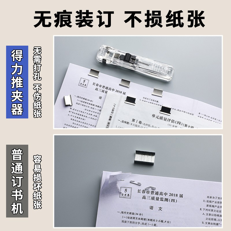 得力无痕订书机无针款钉书器无钉无孔免钉不用钉子的免打孔神器家用书本装订机学生用推夹器文件推书夹文具