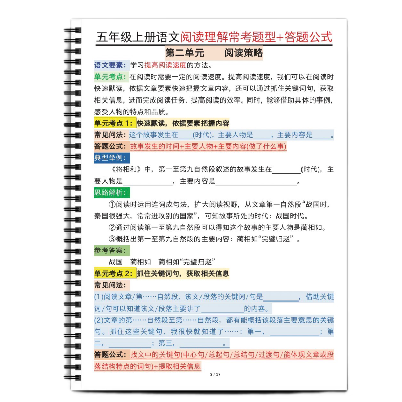 人教版五年级上册语文阅读理解常考题型与答题公式同步单元考点典型举例答题思路解析阅读训练