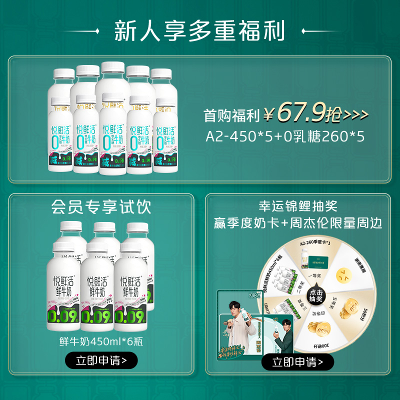 君乐宝悦鲜活鲜牛奶A2型450ml+A2-260ml瓶学生营养低温鲜牛奶