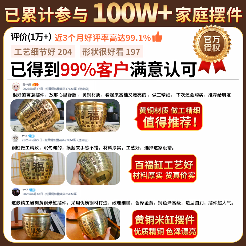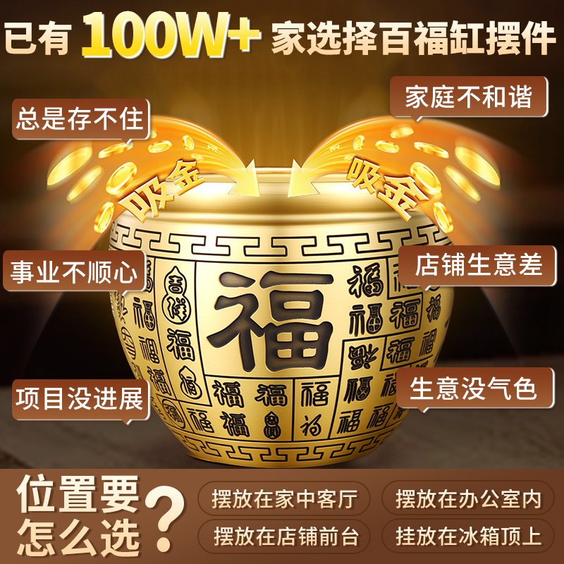 百福铜缸纯黄铜米缸存钱聚宝盆乔迁客厅家居摆件招财进宝元宝冰箱