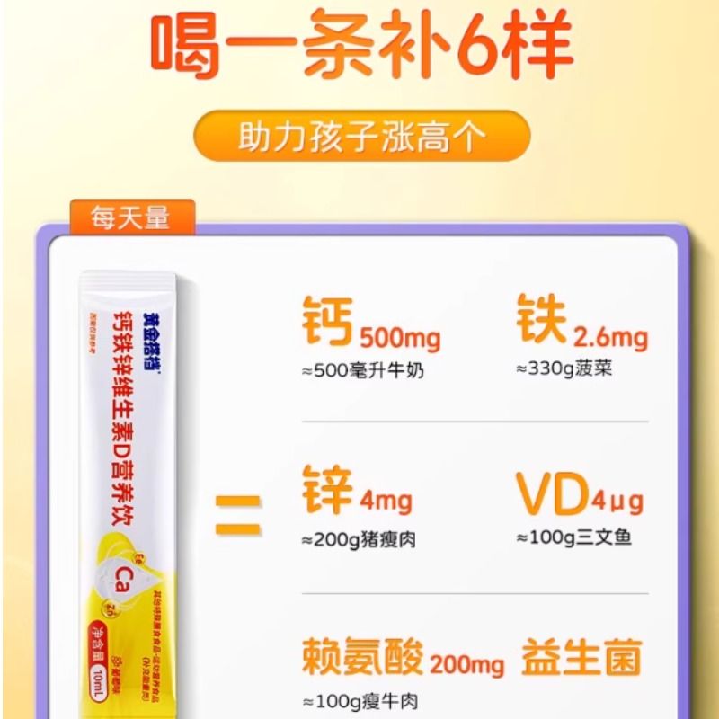 黄金搭档钙铁锌口服液儿童液体钙补钙长高成长增加免疫力直饮包