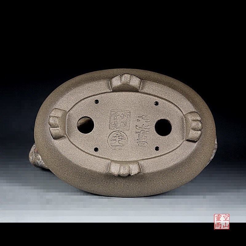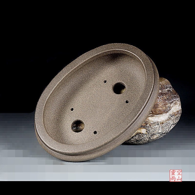 宜兴紫砂精品盆景花盆 全手工仿古蒲口椭圆形乌泥16公分文雅小品