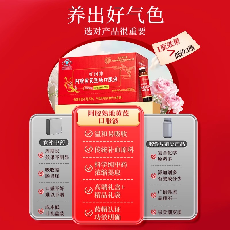 北京同仁堂阿胶黄芪口服液女贫血补气养血女性调理补气血不足补血