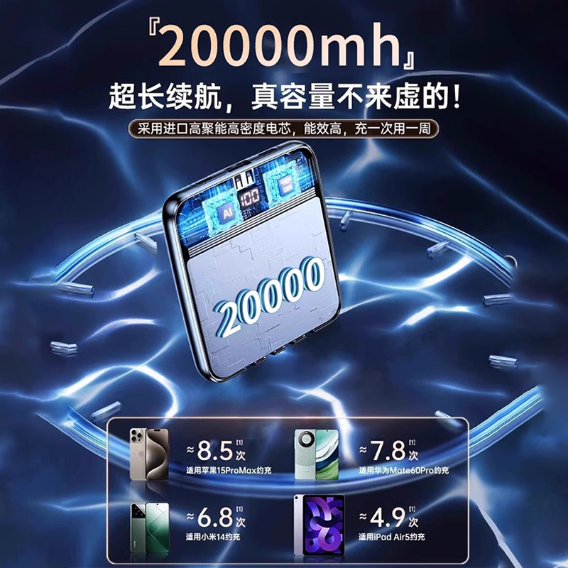 【充电宝3C认证】品胜20000毫安充电宝自带四线大容量超薄小巧便携政府补贴移动电源适用苹果17华为可上飞机