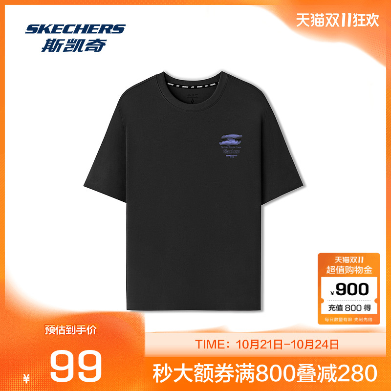 skechers运动休闲服装短袖T恤时尚宽松圆领后领织带装饰胶浆印花