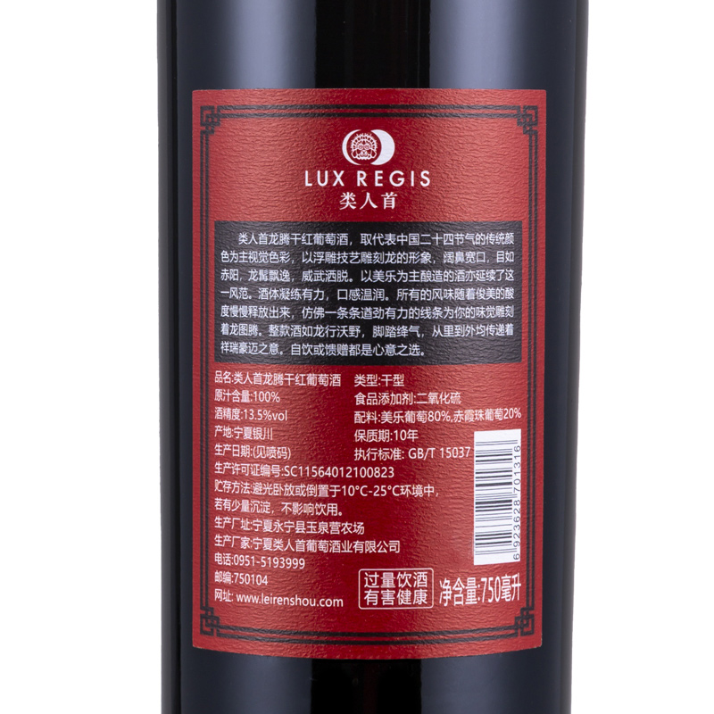 类人首 宁夏红酒贺兰山东麓龙腾美乐橡木桶干红葡萄酒750ml*6支装