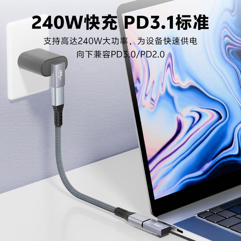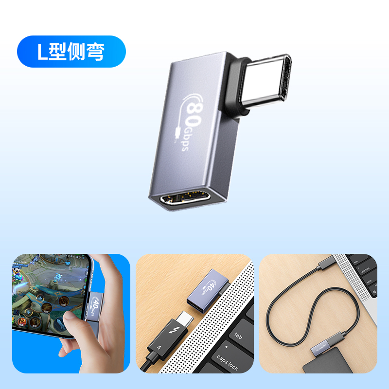 TypeC侧弯公对母全功能转接头80Gbps超高速传输雷电4/5数据线直角L型U型转角适用苹果华为手机平板笔记本延长