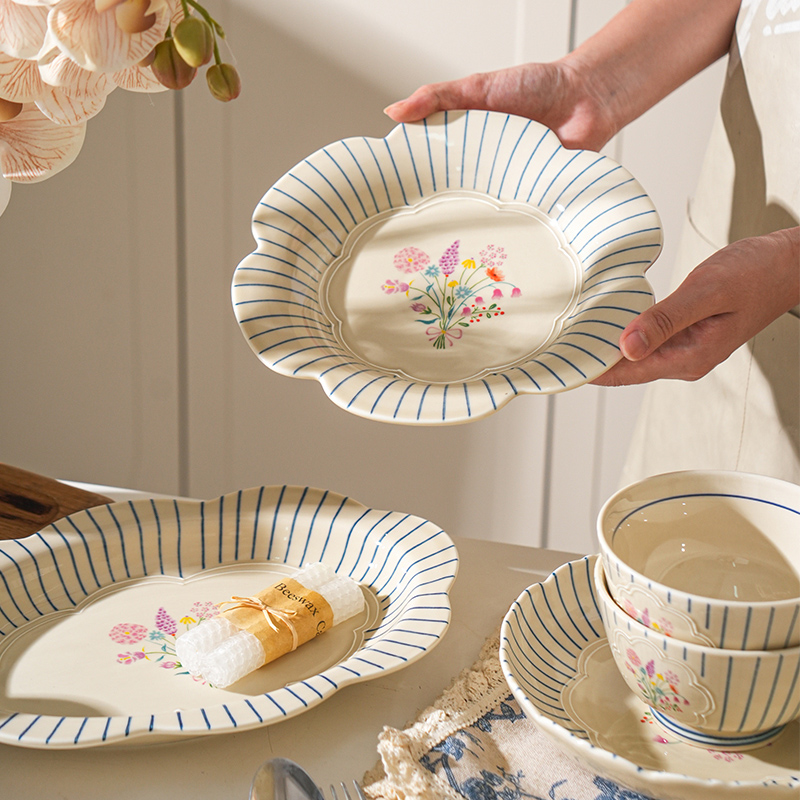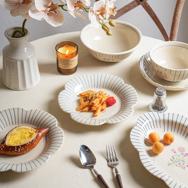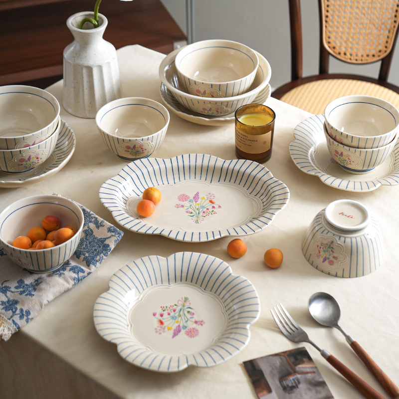 家用高级感陶瓷盘子日式瑞和手绘线条餐具套装深口菜盘精致碗碟子