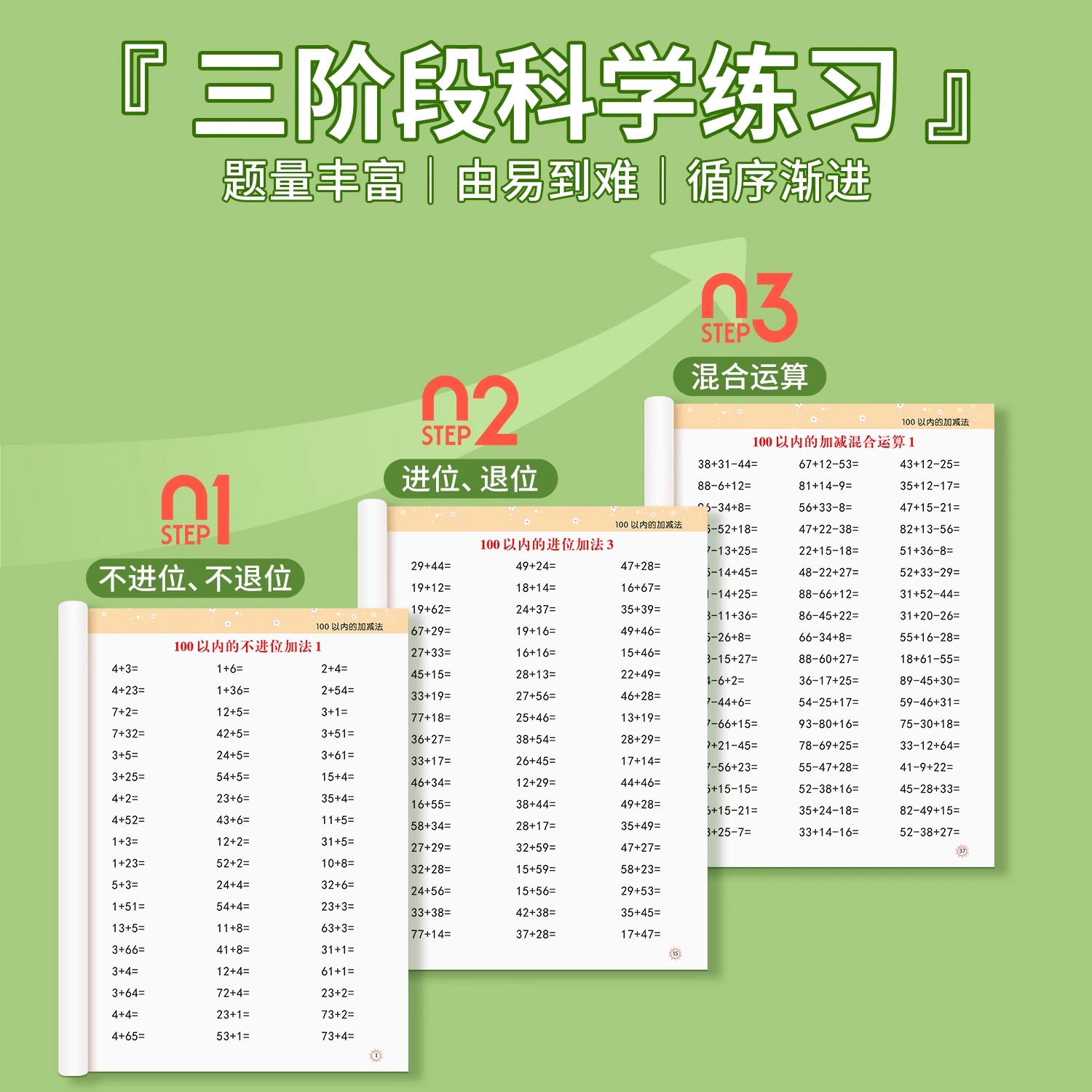 100以内加减法天天练一百进位退位口算题卡每日一练人教版小学一年级数学思维训练口算专项练习本上册下册100以内混合加减法训练册